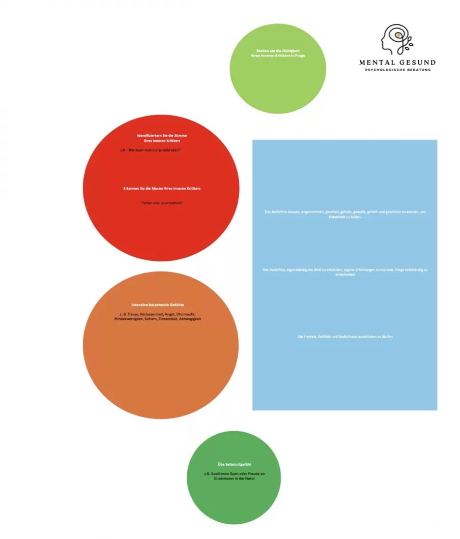 Innere Kindarbeit um spontane Emotionen zu erkennen und neu zu bewerten. Innere Kritikerarbeit zur Aufdeckung und Entkräftung dysfunktionaler Einflüsse, die Ihre Lebensqualität beeinflussen. Sie lernen Ihre emotionalen Grundbedürfnisse kennen. Klare Grenzen zu ziehen. Einen neuen, besseren Umgang mit schmerzlichen Erfahrungen sowie aktuellen belastenden Empfindungen und Gedanken. Ihre Selbstfürsorge zu steigern. Die Freiheit, Gefühle und Bedürfnisse ausdrücken zu dürfen und die Wirksamkeit für sie einzutreten. Einen Perspektivwechsel um flexibel auf schwierige Situationen reagieren zu können. Automatischen Abläufen entgegenzutreten. Gewinn von Entscheidungsfreiheit und Flexibilität. Beziehungen erfüllend zu gestalten.